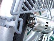 これが別のライトセットから転用したステー。元々フロントフォーク用なので長さがやや長め。フレームには両面テープをつけた1mm厚くらいのゴム板を巻いてかませてあります。ステーに開いている穴は本来ここに先の尖ったネジを締め、塗装を破って地金に触れる事でアースをする為のものですが、なるべく傷つけたくないのでこれはパス。代わりにボルトに丸形端子をかませて別の場所へアースをする事にしたわけです。コードはタイラップでコンパクトにまとめます。